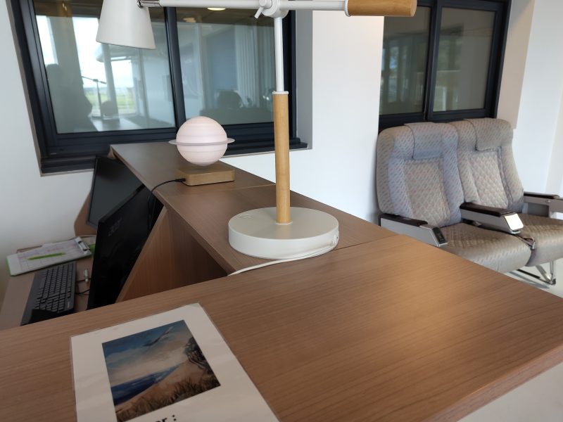 Wenn man es dann am Security Guard hinterm Tor vorbei geschafft hat, kommt man in den neuen Empfangsbereich, der neben sehr bequemen Flugzeugsitzen zum Zeit vertrödeln auch einen schicken neuen Tresen hat. Dessen Highlight ist ein kleines schwebendes Modell des Saturn, das bereits von diversen Mitglieder aus der AG zum Absturz gebracht wurde.